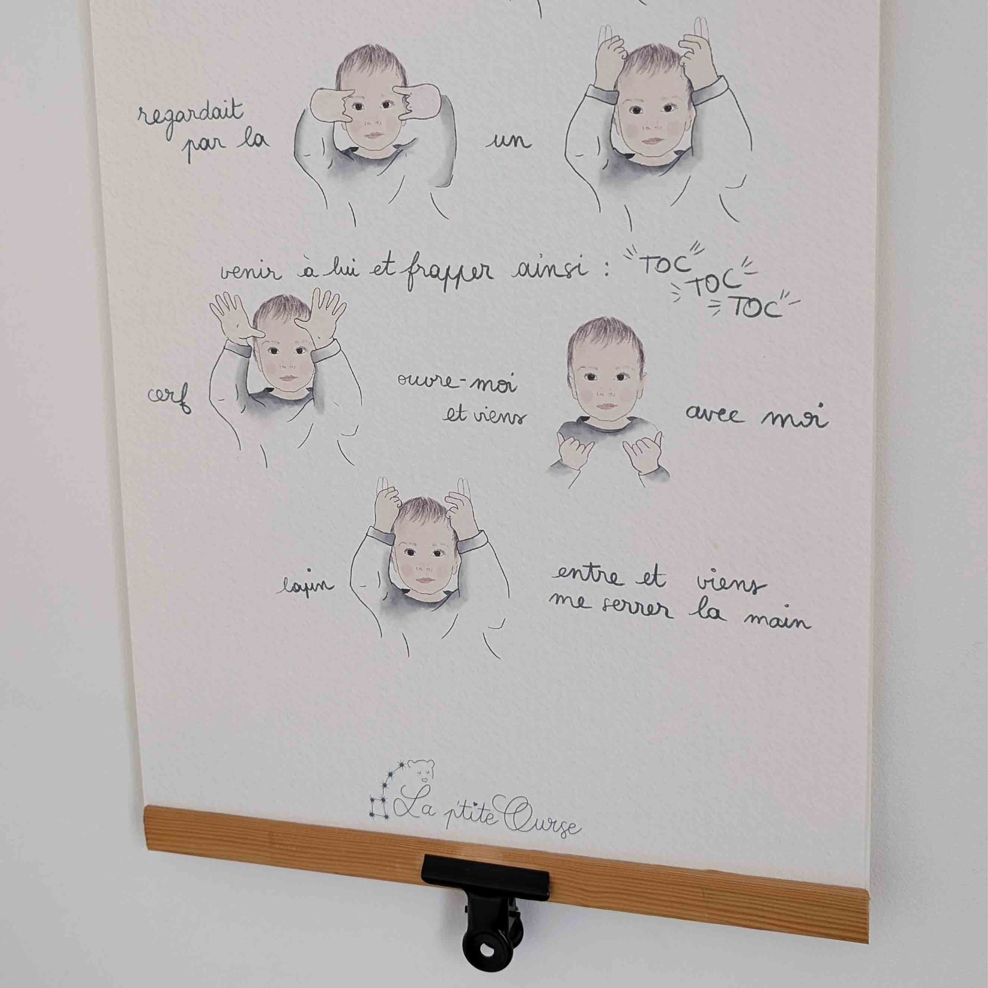 Conseil : placez l’affiche à la hauteur des yeux de votre enfant et chantez en signant ; vous verrez ses mains s’animer !